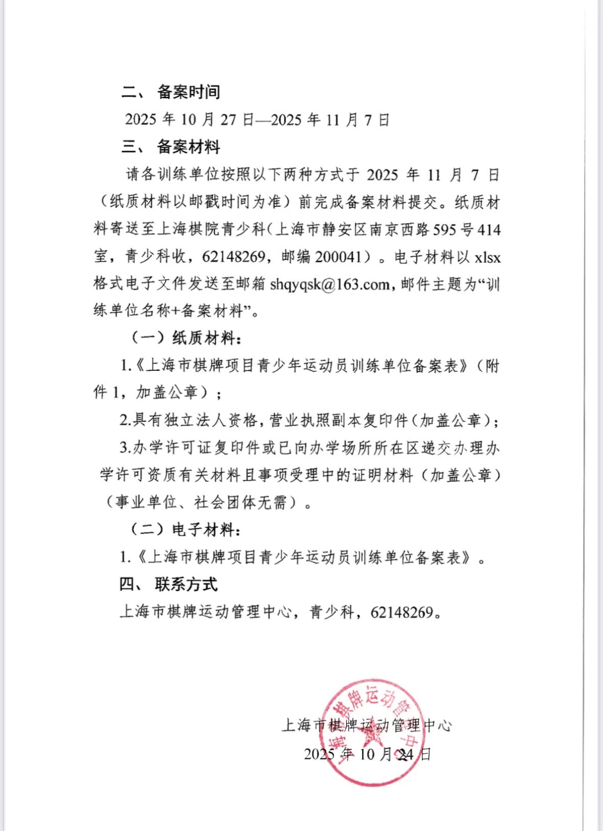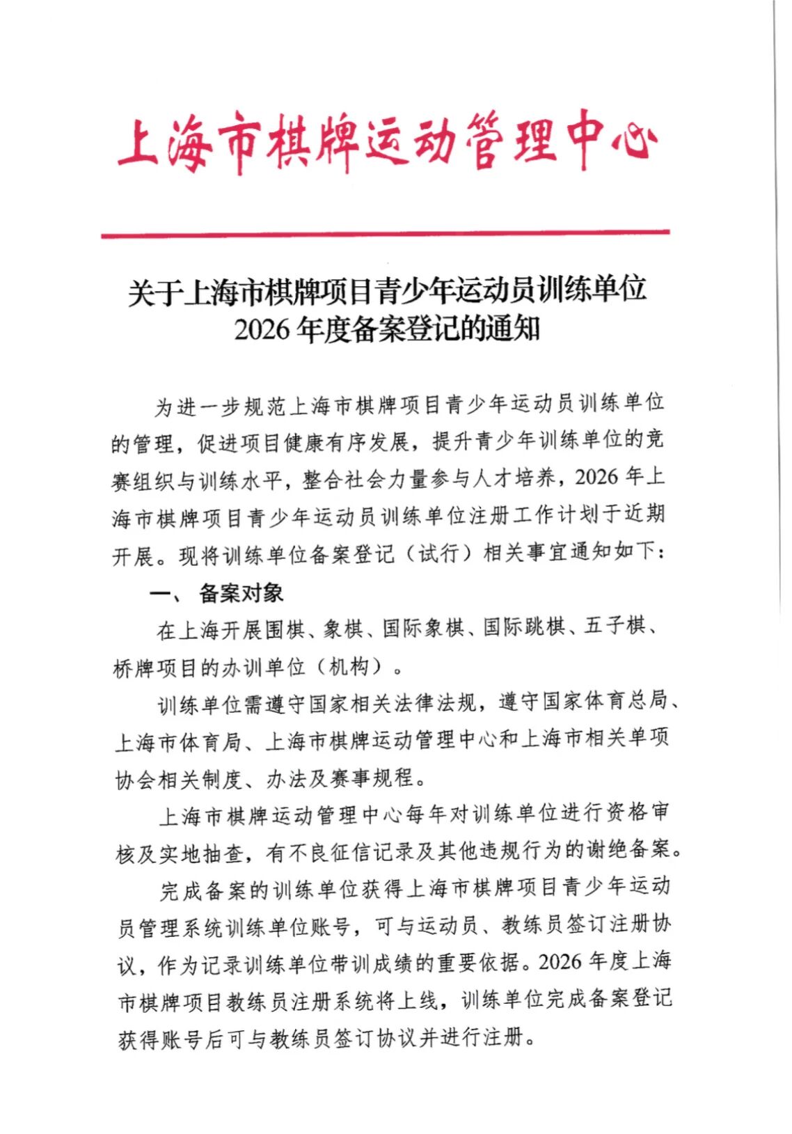 关于上海市棋牌项目青少年运动员训练单位2026年度备案登记的通知