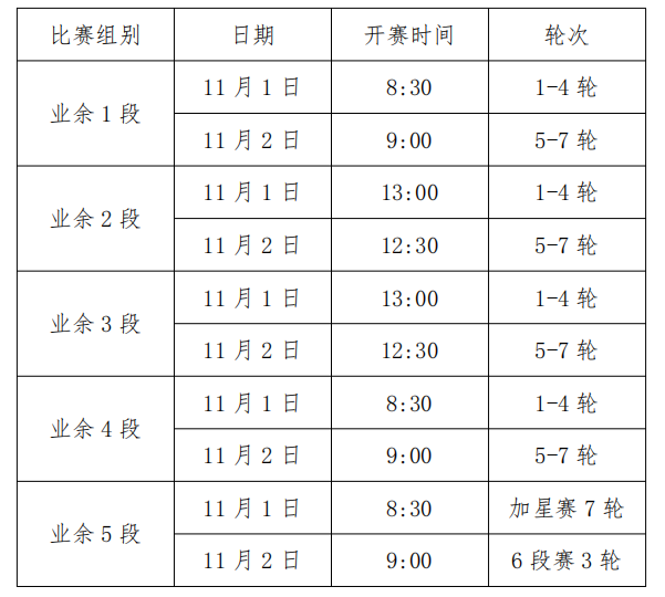 (七)5段组加星赛采用7轮积分编排,用时每方30分钟包干,超时判负。5段组6段赛采用单败淘汰制,用时每方30分钟30秒3次,超时判负;