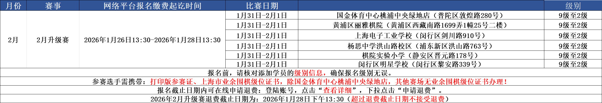 注:本月升级赛只有国金体育中心桃浦中央绿地店有办证,其他赛场仅可补敲章。