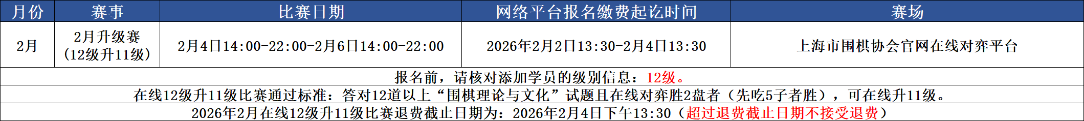 注:本次比赛仅限已参加在线定级,并成绩合格,现级别为12级的选手,未参加在线定级的选手请勿报名。