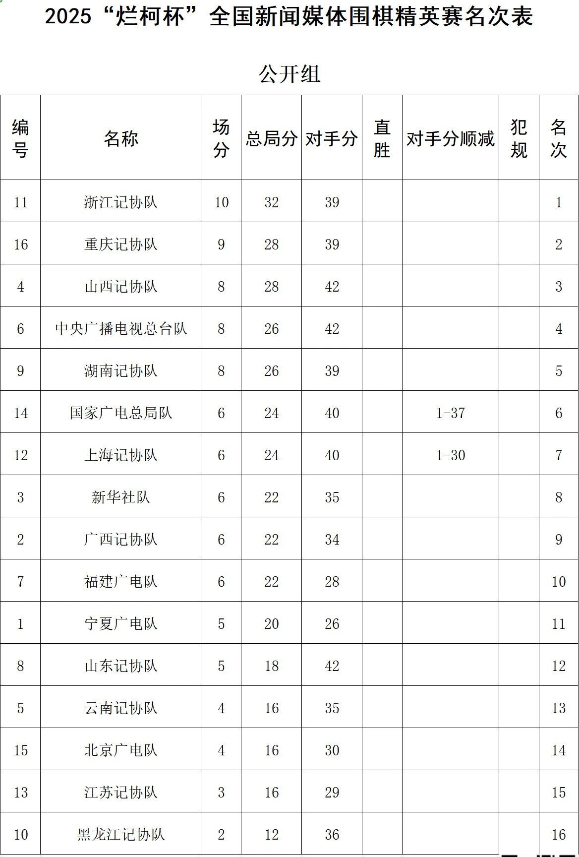 2025年12月7日晚间,2025“烂柯杯”全国新闻媒体围棋精英赛收枰。本次比赛由中华全国新闻工作者协会、中国围棋协会指导,全国广电围棋协会、中国记协机关服务中心、衢州城控集团、衢州市新闻工作者协会、衢州市柯城区石室乡主办,浙江省围棋协会、浙江省新闻工作者协会、衢州市“世界围棋圣地”建设工作专班等单位支持。赛事共吸引了来自全国新闻战线的16支代表队,包含平面媒体、出版、新媒体及自媒体的全业态平台。历经两天六轮的角逐,浙江记协队、重庆记协队、山西记协队分获前三名。