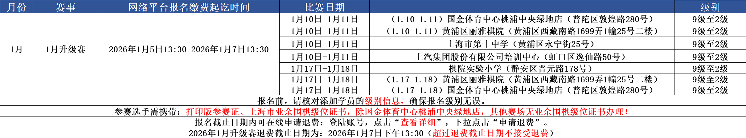 注:本月升级赛只有国金体育中心桃浦中央绿地店有办证,其他赛场仅可补敲章。